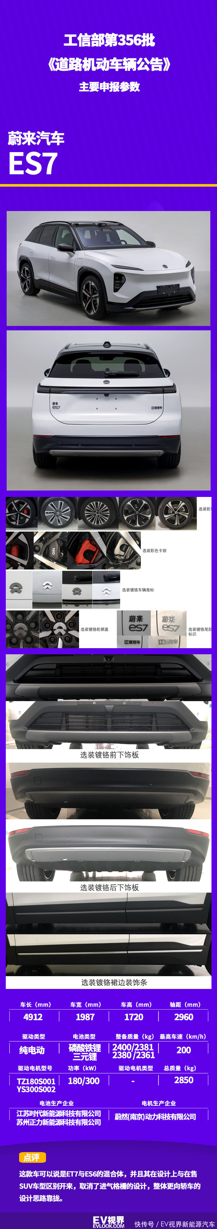 【EV视界报道】日前,EV视界从工信部获得蔚来ES7的申报图。据悉,新车基于NT2.0平台打造而来,介于ES6和ES8之间,定位5座中大型SUV,新车并将于5月底首发,竞争对手锁定为华晨宝马X5长轴距版。